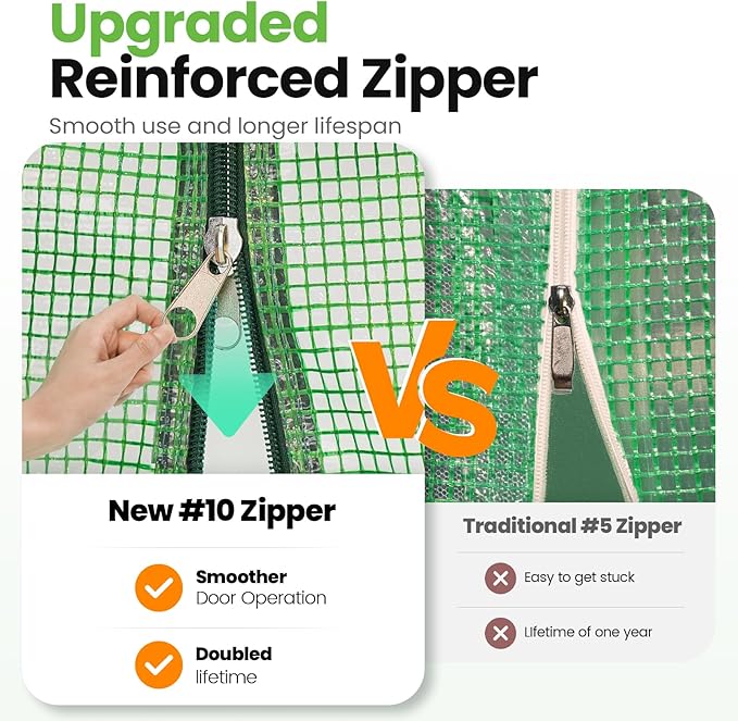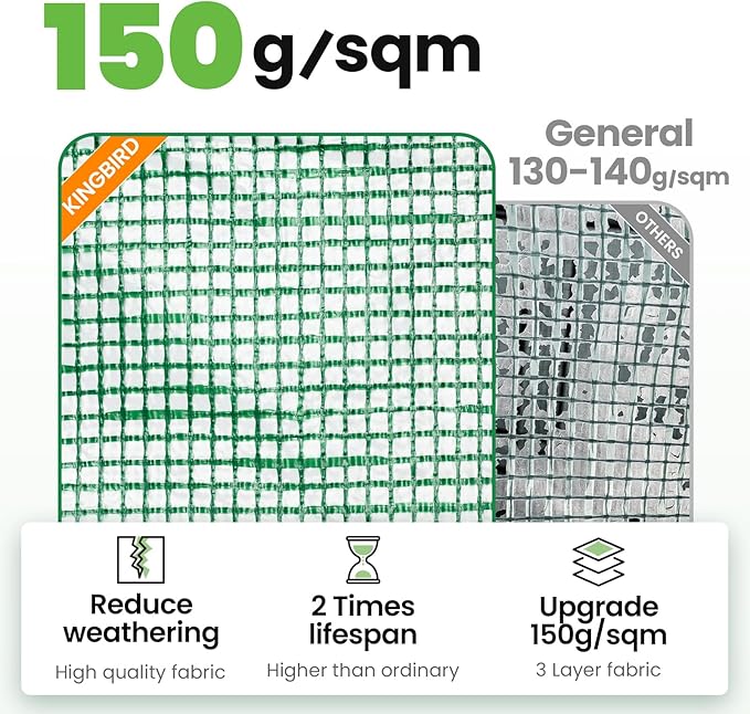 • [UVI 6 Protected Cover]--Our leading waterproof, UV Index 6 protected, and 150g/sqm PE grid cover protects your plants from excess rays, which doubles the service life: Compared to other greenhouse(UVI 1-3) that only lasts for 1-6 months, our KING-cover lasts for over years. The reinforced odorless PE covering material provides safe work zone. The cover fits the frame closely, enhancing warmth and wind resistance.