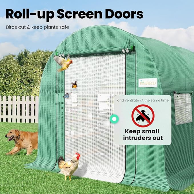 • [Temperature & Humidity Control]--Featured with 8 roll-up screen windows plus 2 door-netting, temperature and humidity can be well-controlled, which increases temperature promoting early spring plant growth, enhances ventilation on hot summer days, and retains warmth during the winter. It keeps plants from pouring rains, winds, and snows.