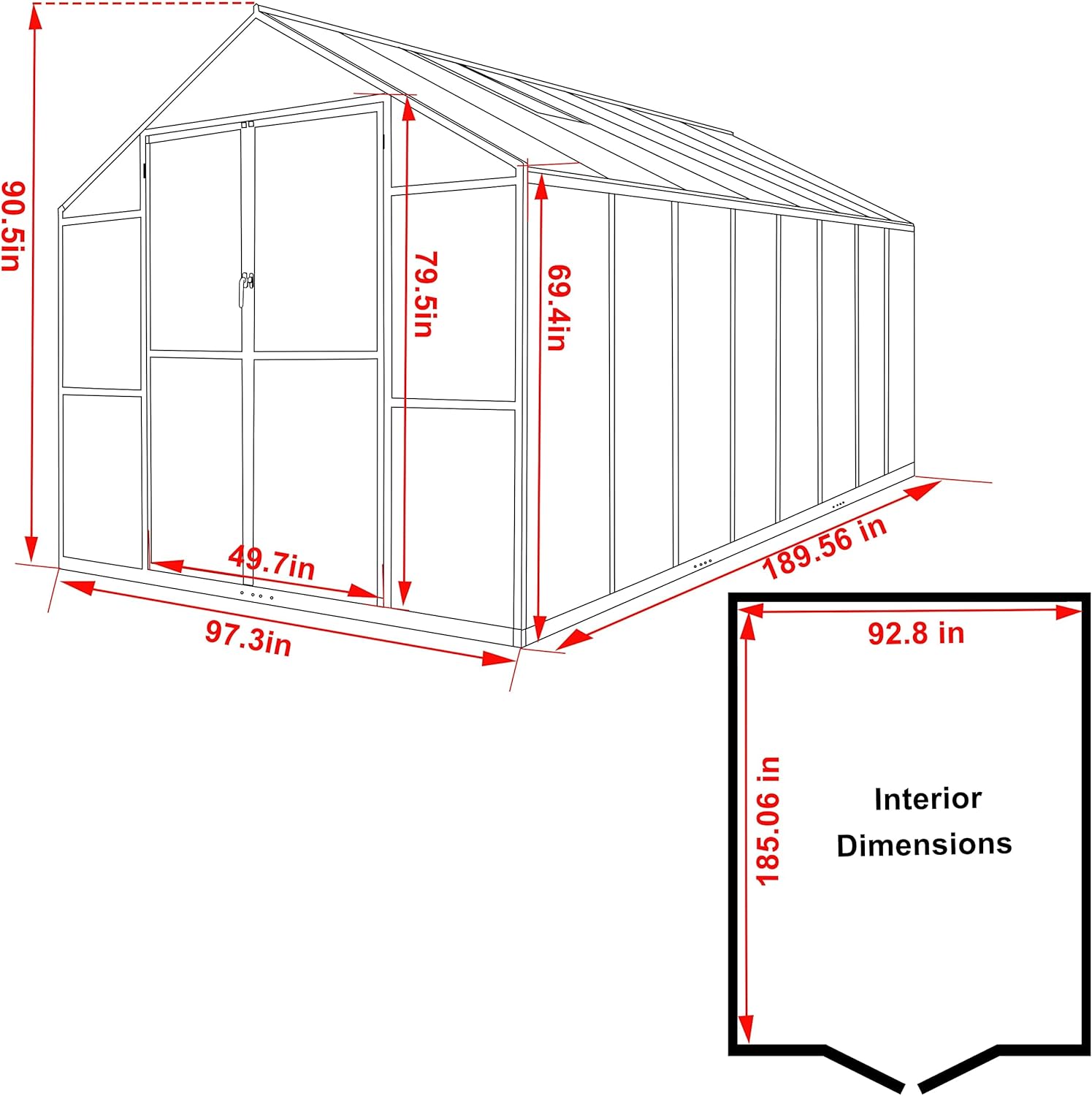 • Dimensions: The overall size of greenhouse: 97.3"W x 189.56"D x 90.5"H. Door size: 49.7"W x 79.5"H. The interior dimension of greenhouse: 92.8"W x 185.06"D