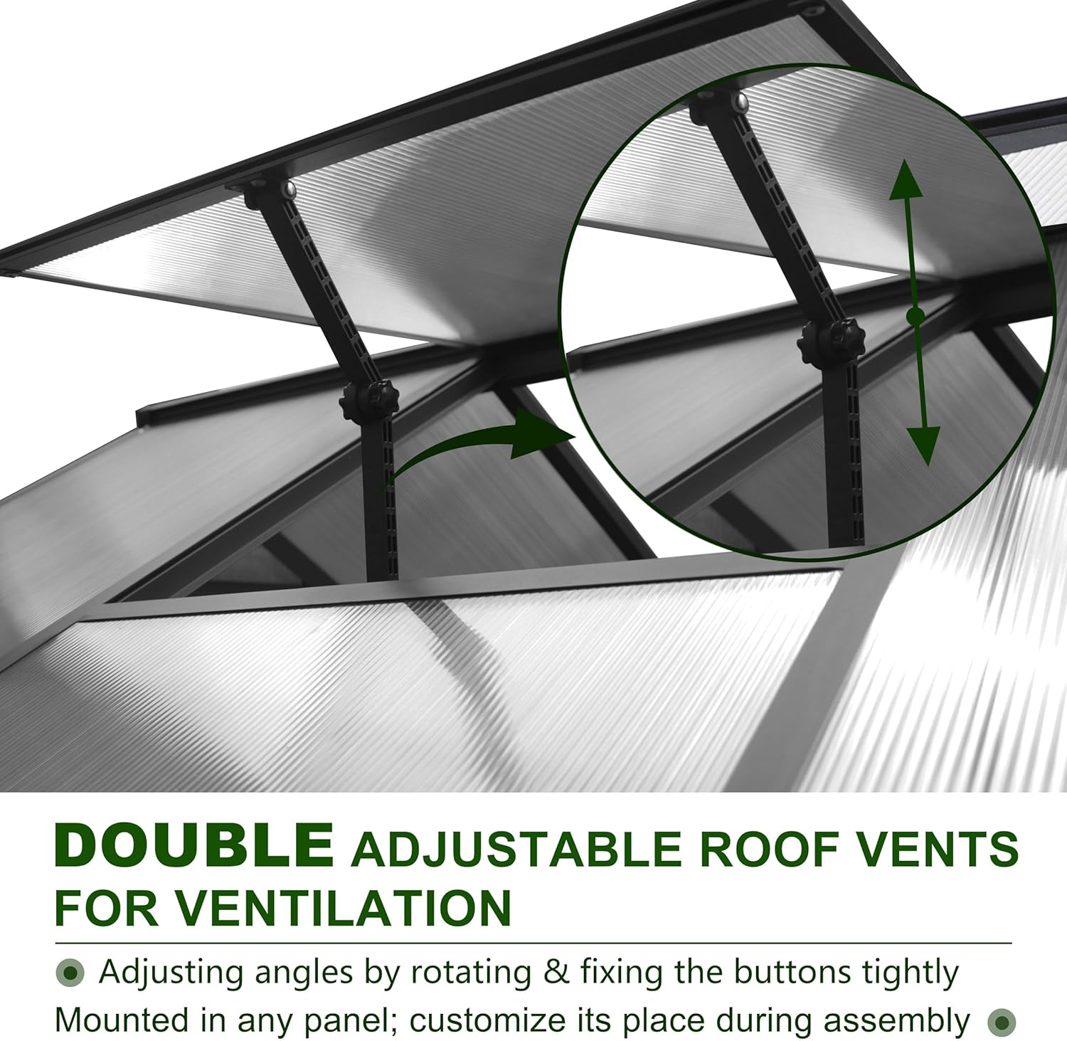 • 4 mm Thickness Polycarbonate Panel: The heavy-duty greenhouse features 4mm multi-layer polycarbonate panels, which can improve sunlight refraction to provide enough light for plants to grow. Besides, it has good heat insulation to keep inside warmer and prevent frost damage. The panel of the greenhouse has scratch resistance, weather resistance, and excellent impact strength