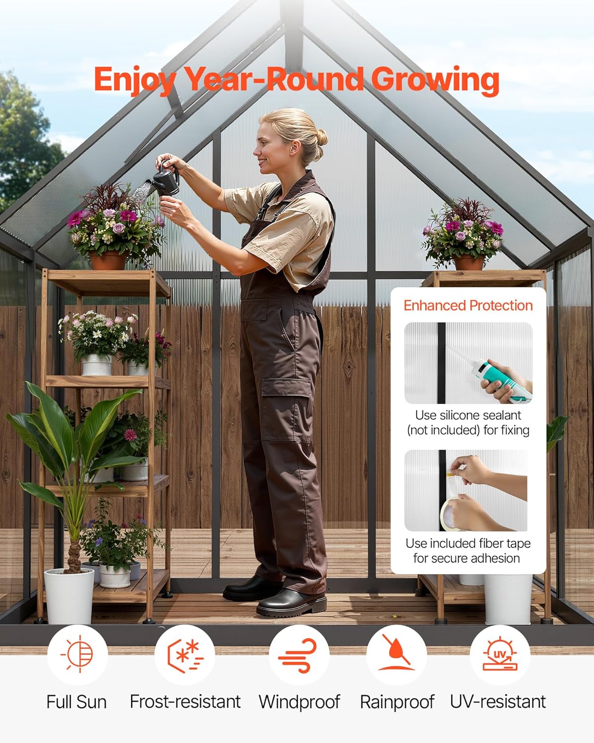 • Durable Premium Materials: Made with 4mm thick PC panels weighing 600g/m², and coated with UV-resistant treatment to avoid yellowing and aging. The high-strength aluminum frame is corrosion-resistant and sturdy, ensuring your plants grow safely in a reliable polycarbonate greenhouse structure.