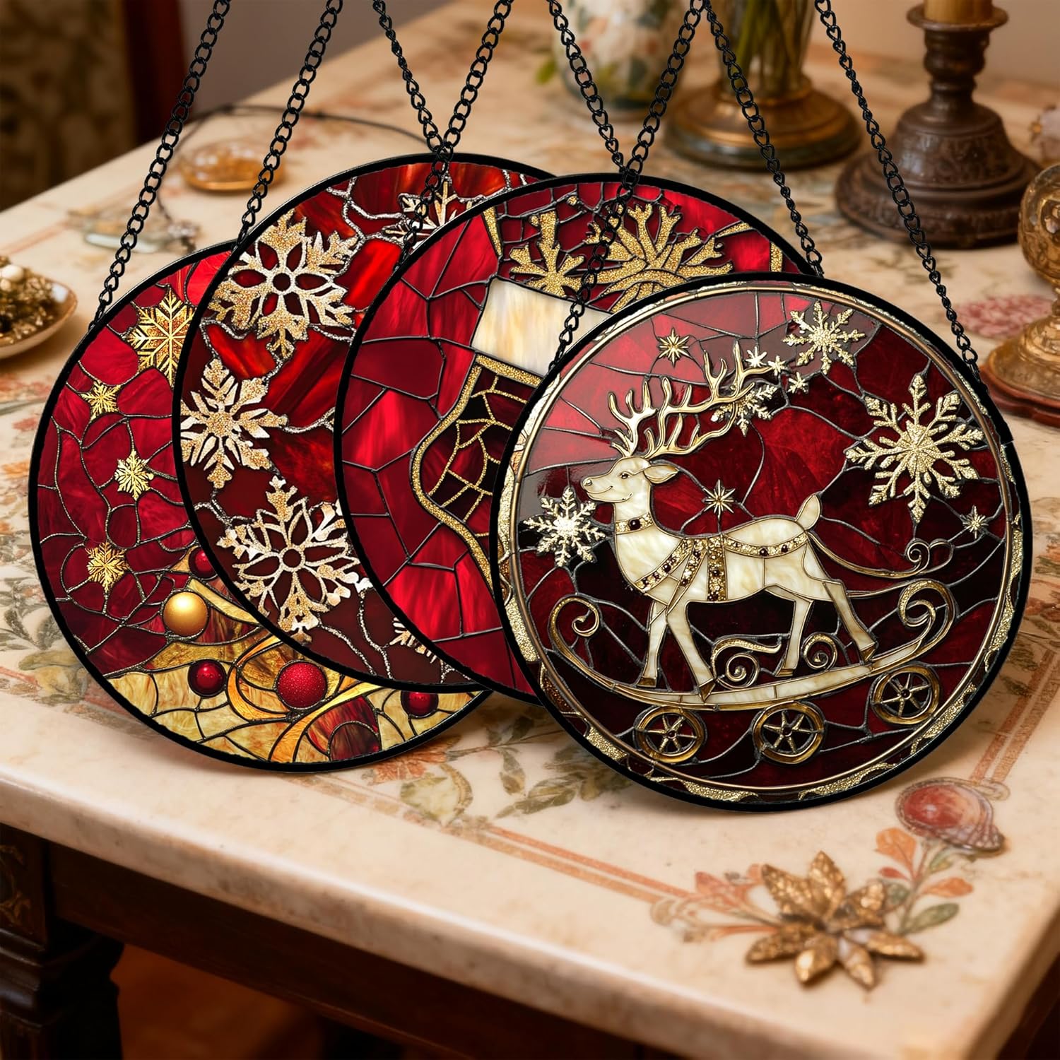 Stained Glass Window Hanging 4 Pcs Set Red Christmas Elk Snowflakes 6.3" - Deer Suncatcher Door Garden Sun Catcher Decor Birthday for Mom Woman Nana Men Friend