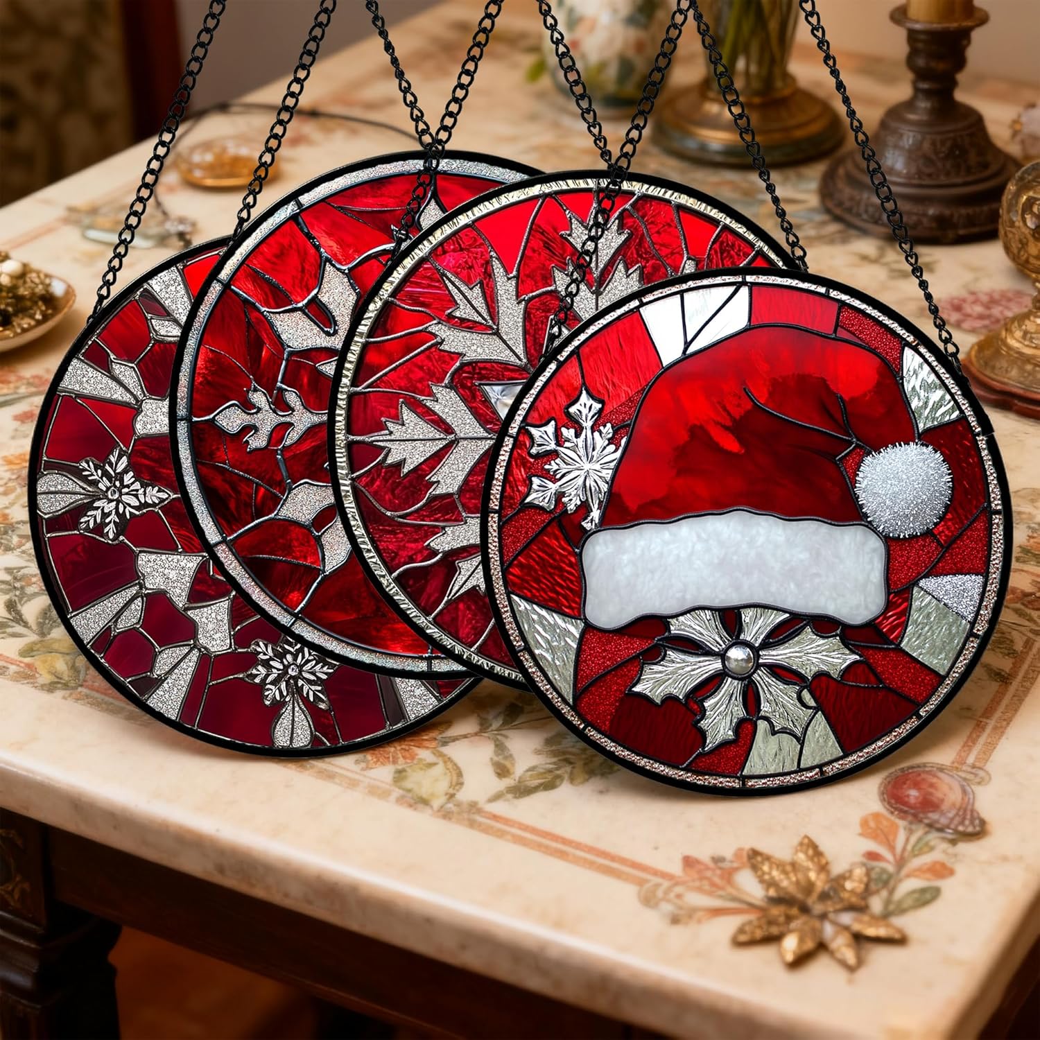 Stained Glass Window Hanging 4 Pcs Set Red Christmas Decorations Theme 6.3" - Suncatcher Door Garden Sun Catcher Decor Birthday for Mom Woman Nana Men Friend Wife