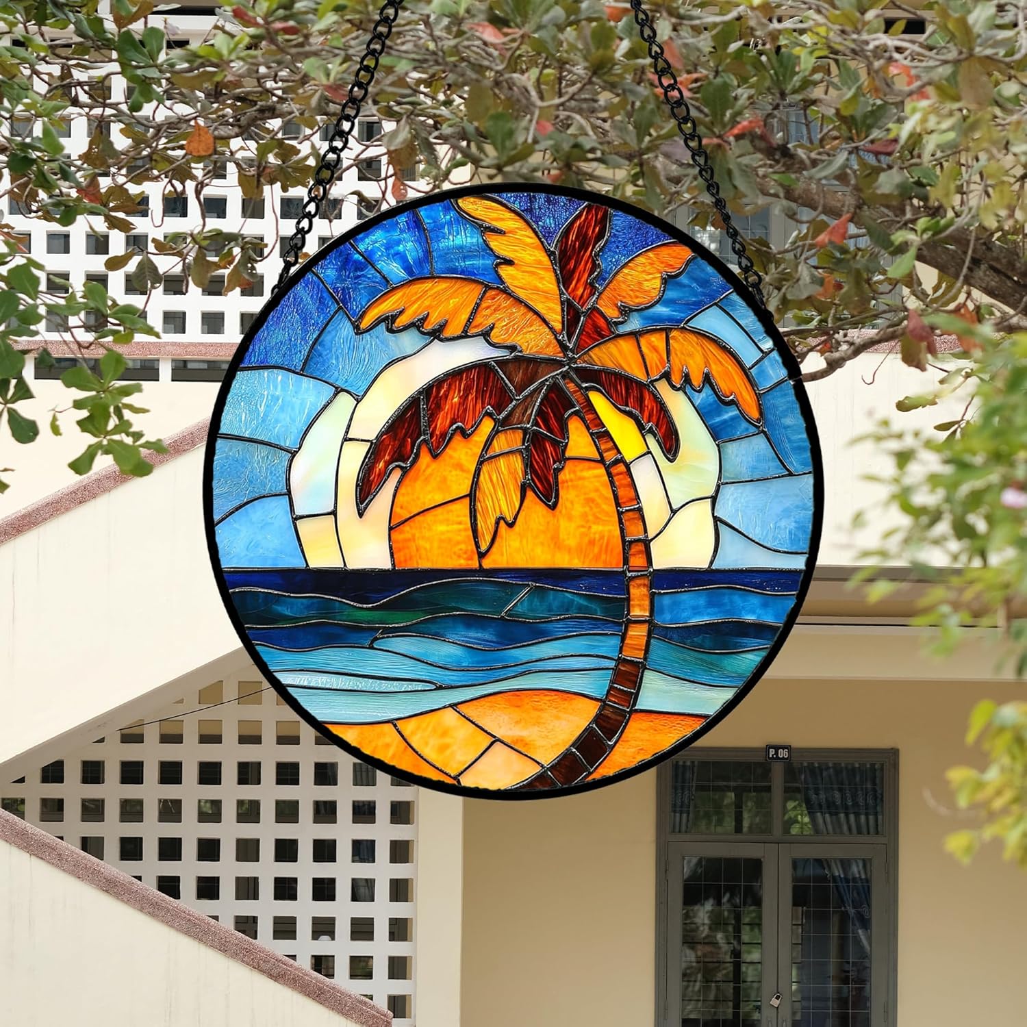 Stained Glass Window Hanging 4 Pcs Set Blue Orange Ocean Beach Theme 6.3" - Suncatcher Door Garden Sun Catcher Decor Birthday Christmas for Mom Woman Nana Men Wife