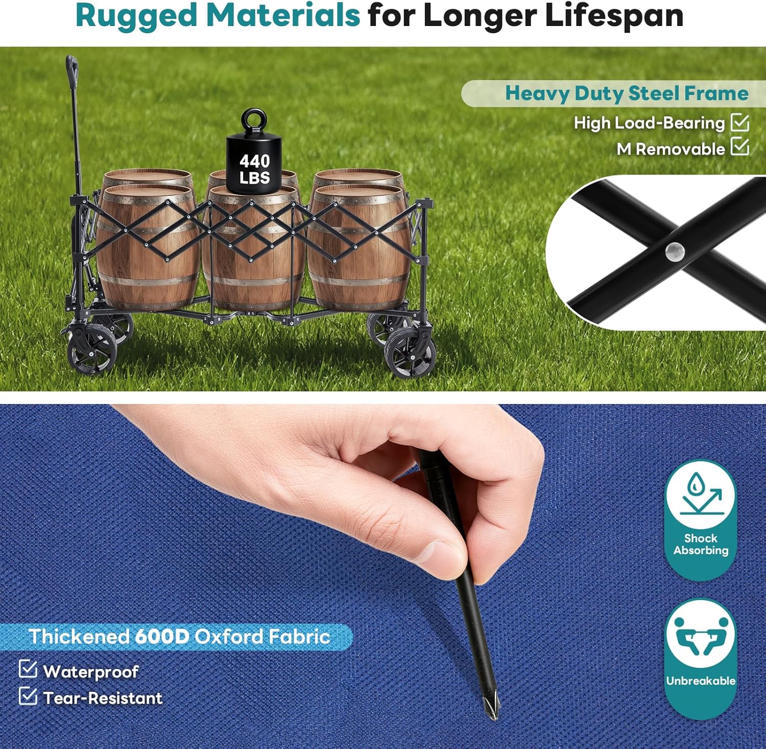 • Easy to Clean: The garden beach wagon for sand body is made of high-density 600D Oxford cloth, which is not only wear-resistant and tear resistant, but also effectively prevents water splashing. After transporting damp swimming equipment and gardening tools covered in soil, simply wipe them with a damp cloth or rinse them with water to give them a fresh and effortless cleaning and maintenance. The sturdy material ensures a long service life and is your reliable camping essential & outdoor partner