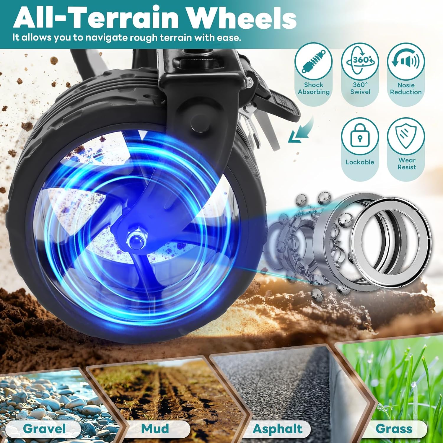 • All Terrain Wide Wheel Design: The shopping cart is equipped with large inflatable tires or wide off-road wheels, which have good shock absorption and grip. Whether on soft beaches, rugged grasslands, pebble paths, or smooth hard surfaces, it can be smoothly pushed forward. The 360 degree rotating wheel design makes steering more flexible and effortless, truly achieving smooth and unobstructed all terrain travel. The front wheels are equipped with braking devices, which fix the trolley to prevent sliding
