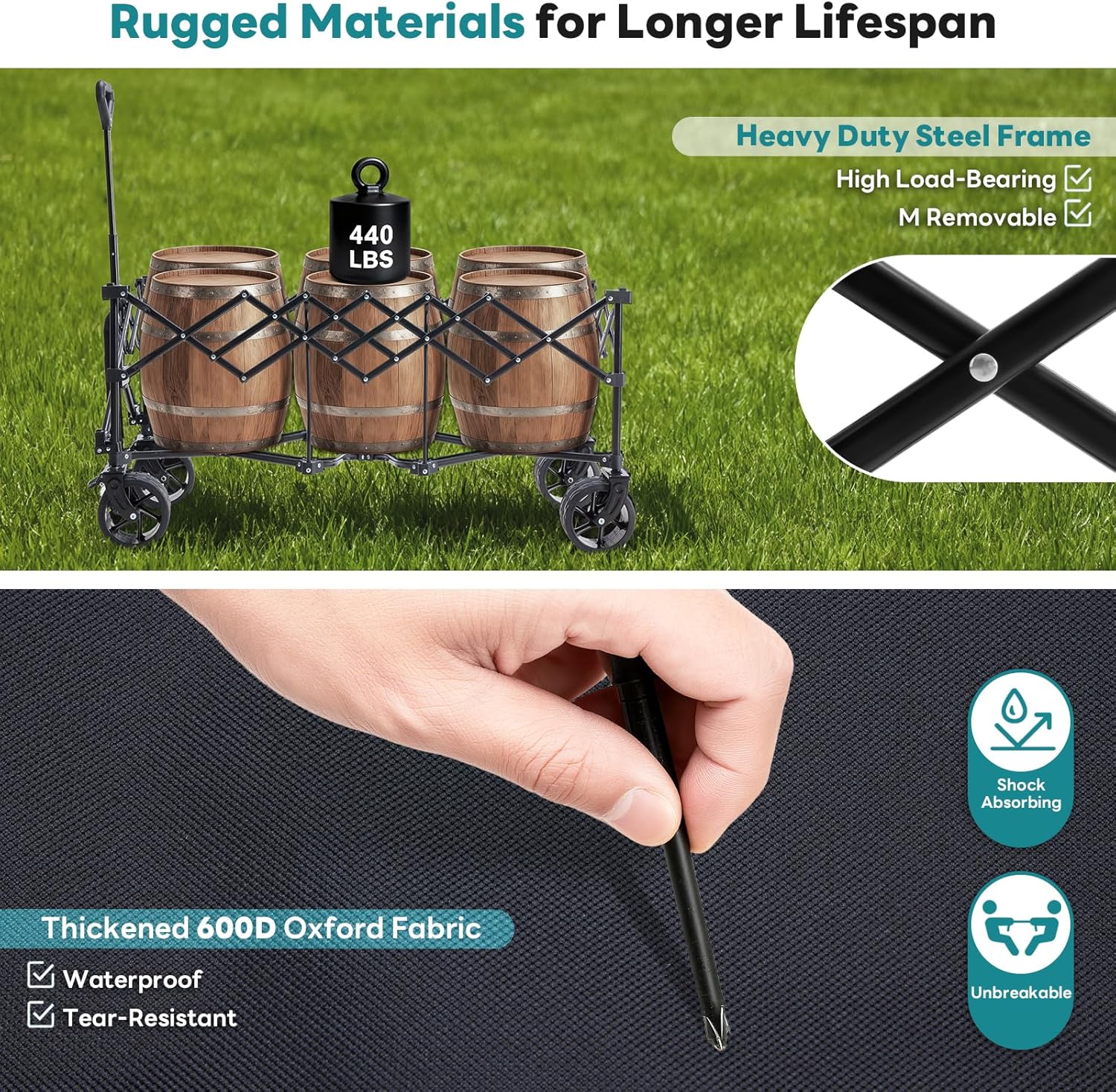 • Easy to Clean: The garden beach wagon for sand body is made of high-density 600D Oxford cloth, which is not only wear-resistant and tear resistant, but also effectively prevents water splashing. After transporting damp swimming equipment and gardening tools covered in soil, simply wipe them with a damp cloth or rinse them with water to give them a fresh and effortless cleaning and maintenance. The sturdy material ensures a long service life and is your reliable camping essential & outdoor partner