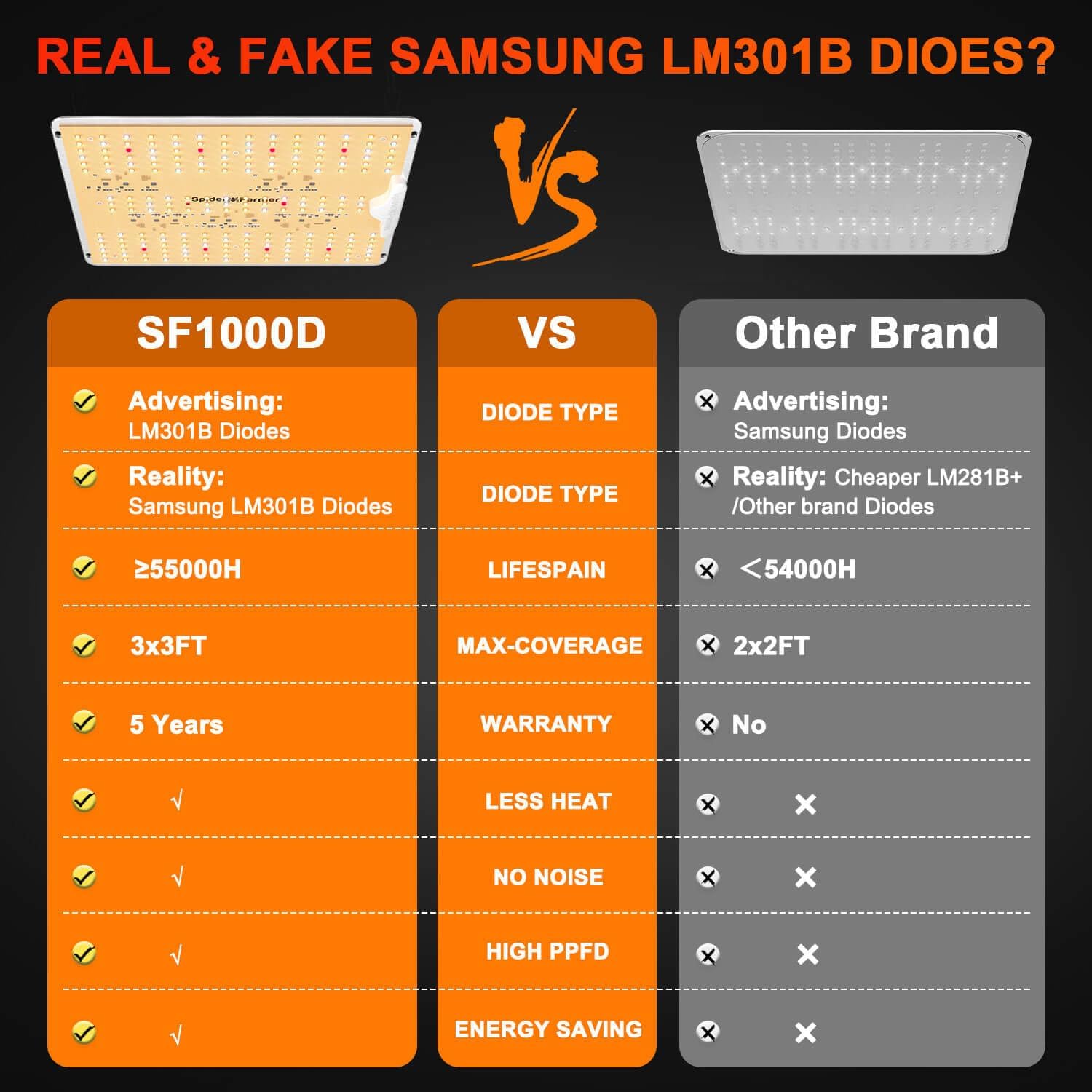 • SAMSUNG LM301B Diodes: 2025 New Version SF1000D LED grow light uses premium Samsung LM301B diodes and LED plant light technology, delivers powerful light output and uniform canopy penetration, lights can be absorbed better by plants. Veg footprint is 3 x 3 ft, Flowering footprint is 2 x 2 ft.