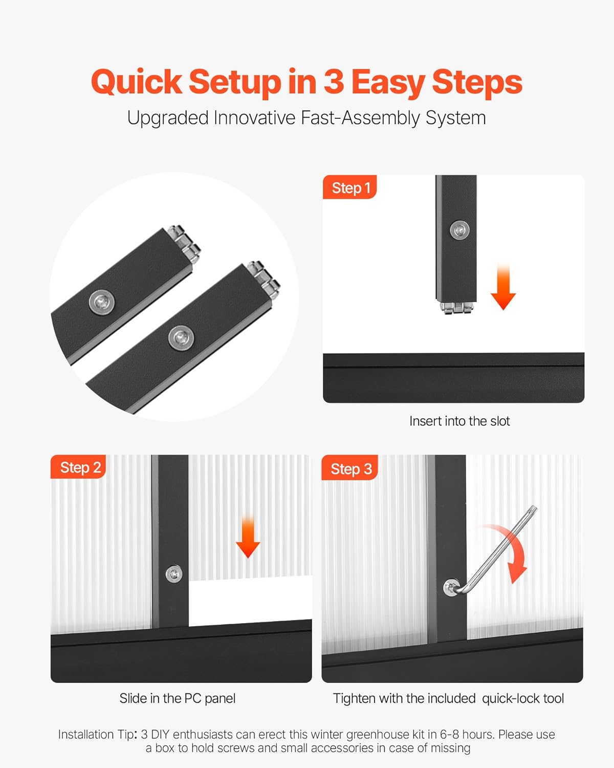 • Quick Assembly Design: The walk-in greenhouse features a quick-assembly system and slide-in panel design. With the included fast-lock tools, you can easily assemble the outdoor greenhouse in about 2.5 hours (recommended 2-person setup). Using the included tape or silicone sealant can further strengthen the structure and extend its lifespan.