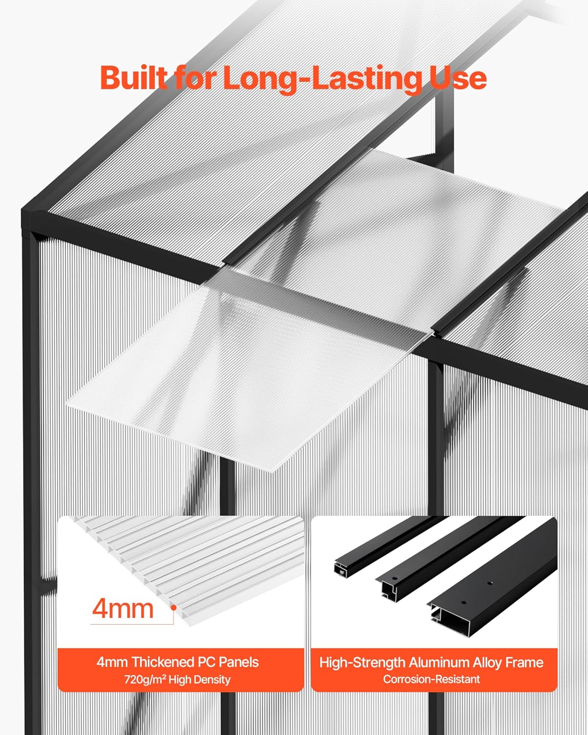• Durable Premium Materials: Made with 4mm thick PC panels weighing 720g/m², and coated with UV-resistant treatment to avoid yellowing and aging. The high-strength aluminum frame is corrosion-resistant and sturdy, ensuring your plants grow safely in a reliable polycarbonate greenhouse structure