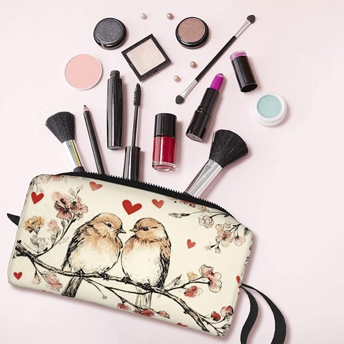 • Versatile & Simple Design: With a single main compartment, this Two Birds on Branch with Hearts​ Travel makeup bag is perfect for travel, gym, weekend getaways, or daily use, helping you stay organized effortlessly.